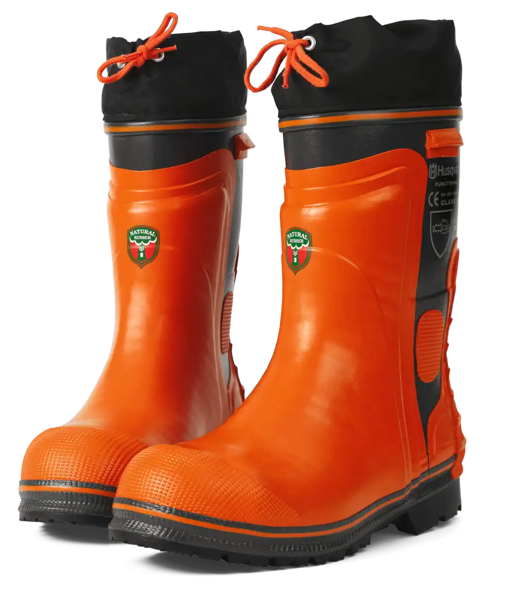 Work-ready Husqvarna logging boots that offer chainsaw resistance, waterproof protection, oil-resistant soles, and steel toes for optimal safety. Made of high-quality natural rubber, the boots feature cotton pile linings and 4-layer insoles, along with heel grips and ankle guards. Optional liners and caulks available. Meets OSHA Regulation 1910.266, and the steel toes meet ANSI and CSA standards (ANSI Z41-1999 I/75 C/75).