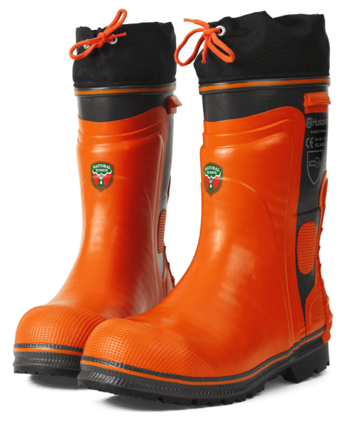 Work-ready Husqvarna logging boots that offer chainsaw resistance, waterproof protection, oil-resistant soles, and steel toes for optimal safety. Made of high-quality natural rubber, the boots feature cotton pile linings and 4-layer insoles, along with heel grips and ankle guards. Optional liners and caulks available. Meets OSHA Regulation 1910.266, and the steel toes meet ANSI and CSA standards (ANSI Z41-1999 I/75 C/75).